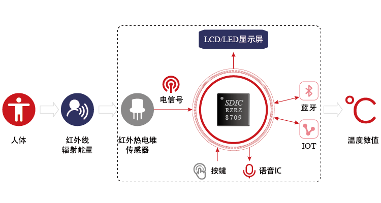 近几年来,非接触红外人体测温仪在技术上得到迅速发展,性能不断完善,功能不断增强,品种不断增多,适用范围也不断扩大。基于我司凯发一触即发微SD8000系列芯片的红外测温仪方案,通过热电堆红外传感器测量温度并传递信号至芯片,由LCD显示。此测温仪电路简单,外围器件少、功耗低,读数准确快捷,非接触式,使用安全及使用寿命长,可用于快速筛查温度。