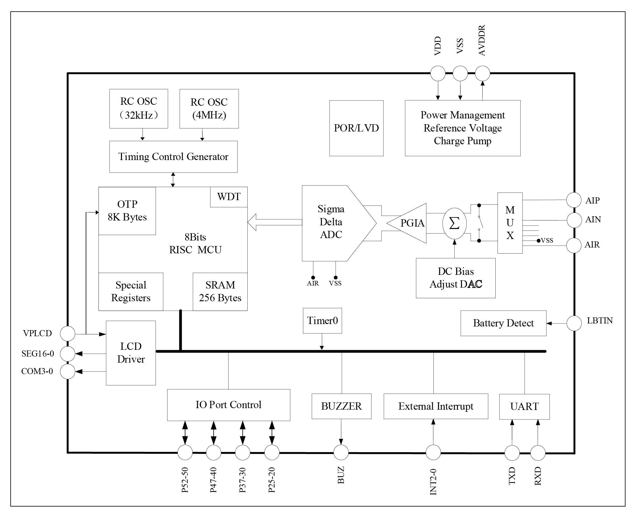 8 bits RISC low power MCU, 49 instructions and 6 stack levels. The MCU current consumption is 800uA typically at 3V and 2MHz operating clock rate. Standby current is 2μA at 32kHz clock, and less than 1μA at sleep