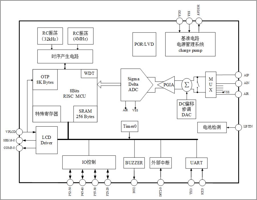 8位RISC超低功耗MCU,49条指令,6级堆栈,在2MHz工作时钟,MCU部分在3V 工作电压下电流典型值为800μA; 32kHz时钟待机模式下工作电流2μA,休眠模式 电流典型值为1μA