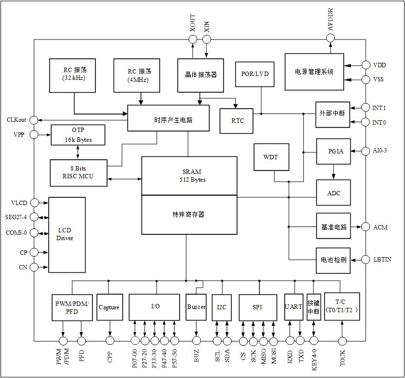 8位RISC超低功耗MCU,在2MHz工作时钟,MCU部分在3V工作电压下电流 典型值为300μA;32kHz时钟待机模式下工作电流1.5μA,休眠模式电流小于 1μA