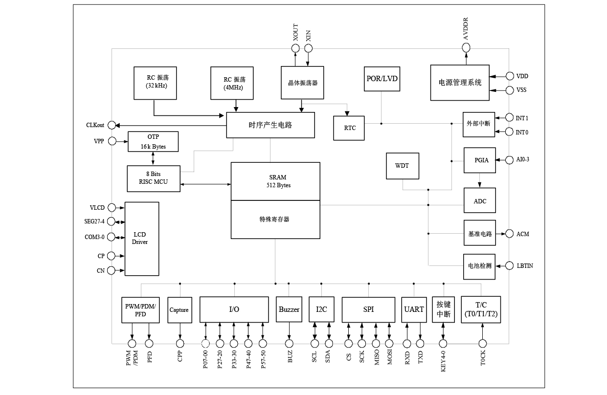 本芯片是高精度24位ADC的SoC产品,外围资源丰富:RTC,可选的多种稳压电源输出,灵活设置的PGIA模块,升压模块, UART、I²C、SPI、TIMER、PWM/PDM、PFD、CAPTURE输出模块,LCD驱动等。