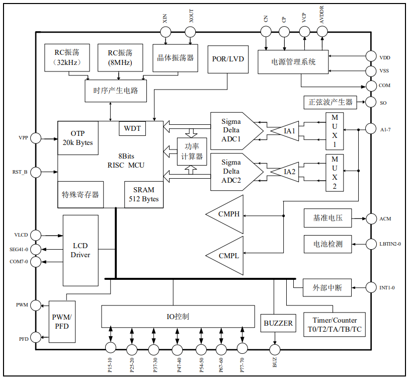8位RISC超低功耗MCU,49条指令,6级堆栈,在2MHz工作时钟,MCU部分在3.3V工作电 压下电流典型值为400μA;32kHz时钟待机模式下工作电流1.5μA,休眠模式电流小于1μA