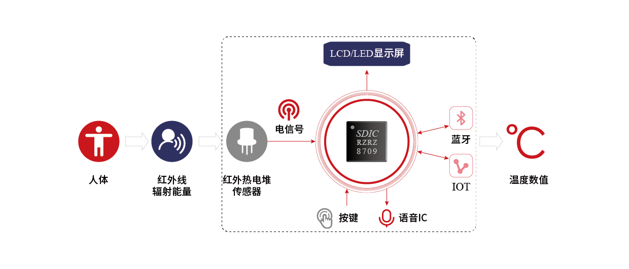 近几年来,非接触红外人体测温仪在技术上得到迅速发展,性能不断完善,功能不断增强,品种不断增多,适用范围也不断扩大。基于我司凯发一触即发微SD8000系列芯片的红外测温仪方案,通过热电堆红外传感器测量温度并传递信号至芯片,由LCD显示。此测温仪电路简单,外围器件少、功耗低,读数准确快捷,非接触式,使用安全及使用寿命长,可用于快速筛查温度。