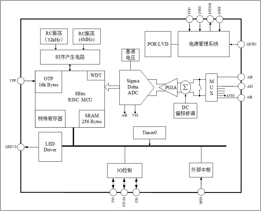 本芯片是带20位ADC的SoC产品,程序存储器为16k Bytes OTP。芯片外围器件很少,非常适合带LED显示的人体秤和厨房秤等家用秤的应用。