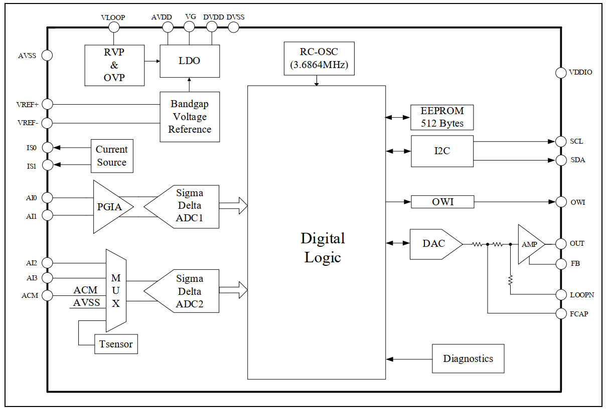 SD23M101高度集成,用于阻式或电压型传感器,如扩散硅、陶瓷、单晶硅等压力传感器信号调理及变送输出芯片。片内集成高压电源模块,24位主信号测量ADC,24位温度测量ADC,仪表放大器,恒流源、恒压源激励,支持OWI等数字接口,支持4-20mA、0-5V、0-10V变送输出。高度集成,使用很少的外围器件,即可实现方案与调试工作。内置高压电源模块,允许最高40V的电压输入芯片,0-10V输出模式电路更简单。内置多种传感器校准算法,如3P3T、5P5T、7P7T,校准参数保存在芯片内部的EEPROM中。内置温补算法,使得方案的整体温漂更小。